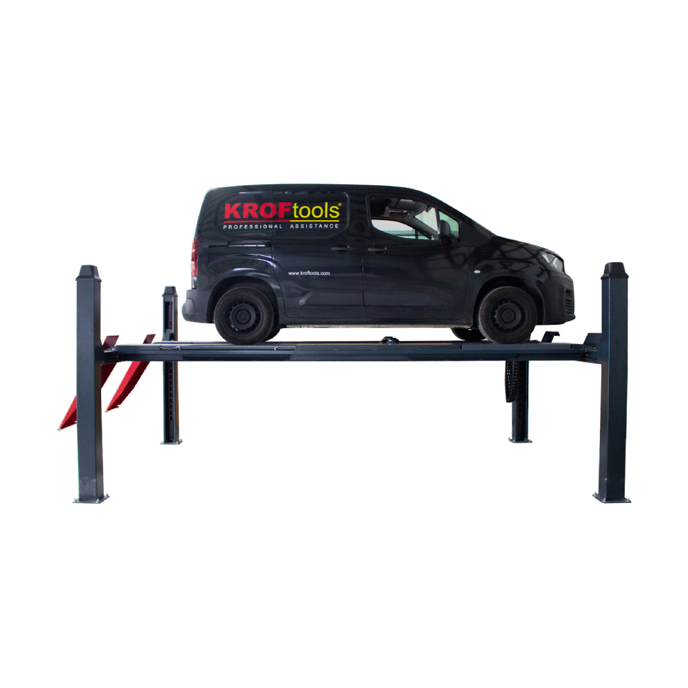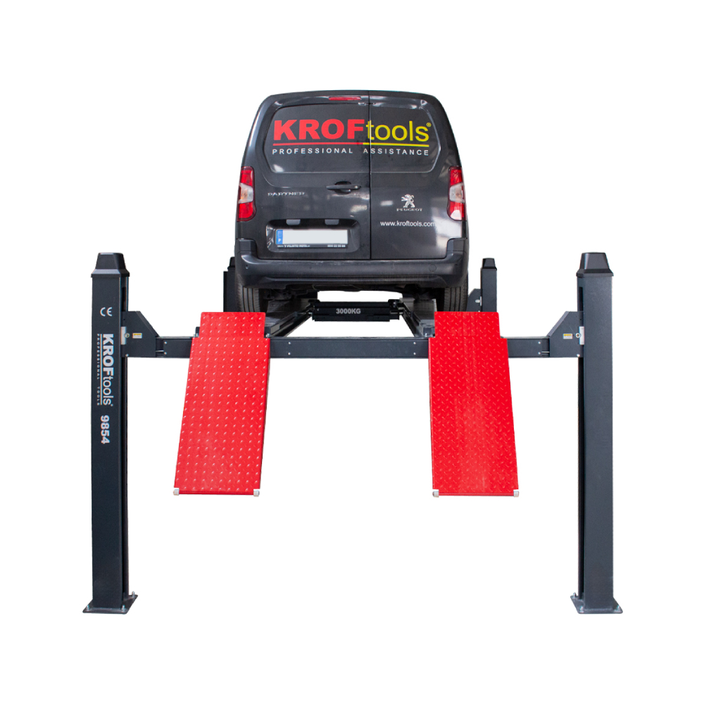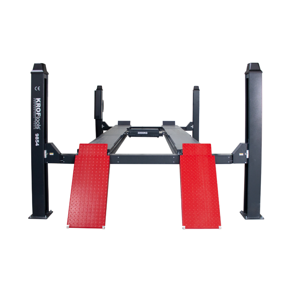 Elevador automotivo de 4 colunas Kroftools 9854, projetado para alinhamento de veículos com máxima precisão. Equipado com um sistema eletro-hidráulico robusto, suporta cargas de até 5 toneladas, garantindo estabilidade e segurança para uso profissional em oficinas.