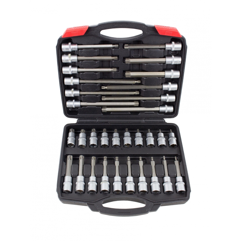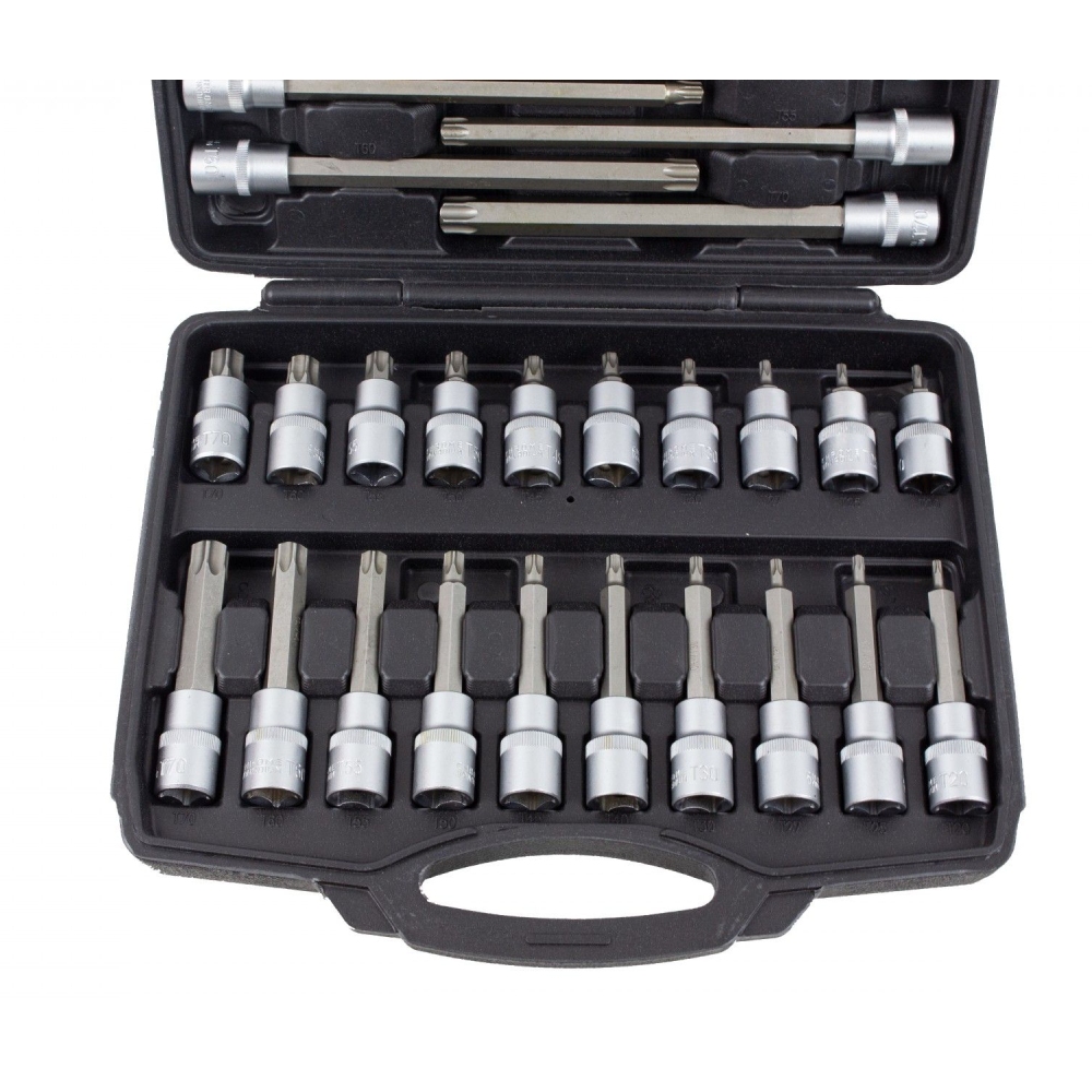 Conjunto 32 peças Torx Kroftools 6032, quadra 1/2″, em Chrome Vanadium. Inclui chaves T20 a T70 com comprimentos 55mm, 100mm, 140mm e 200mm.